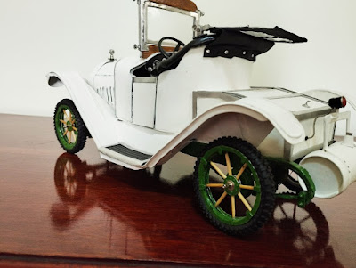 Nesta nova miniatura, retratei um carro centenário, do início da história da Chevrolet. A empresa foi fundada em 1911, por Willian C. Durant. Começou a produzir seus carros, depois de Durant haver trabalhado na equipe de competição da Buick, com Louis Chevrolet. O nome Chevrolet, era bem estabelecido na comunidade das corridas naquela época. Chevrolet queria produzir carros bem acabados, e feitos com cuidado e perfeição. Já Durant queria fabricar carros mais populares e vendáveis. Este impasse fez com que Chevrolet, saísse da sociedade em 1914. O nome Chevrolet permaneceu, e neste mesmo ano, foi adquirida a Maxwell Motor Company em NY. Foi fundado um escritório de vendas em Oakland na Califórnia. A intenção de Durant, era competir com Henry Ford, que já estava estabelecido com seu Modelo T, e vendia milhares de carros. O modelo H era uma série mais bem acabada, e luxuosa, do que o modelo mais popular que viria a seguir, o 490. O motor do modelo H era um quatro cilindros em linha de 24hp (que foi usado até 1928 em outros modelos). O Roadster custava US$ 750.00, e era em comparação com o Ford T que custava US$ 500.00 muito mais caro. Era semelhante ao fabricado no ano anterior, mas com o entre-eixos um pouco mais longo. Um volante maior de 17 polegadas, e pneus maiores, com aros desmontáveis.